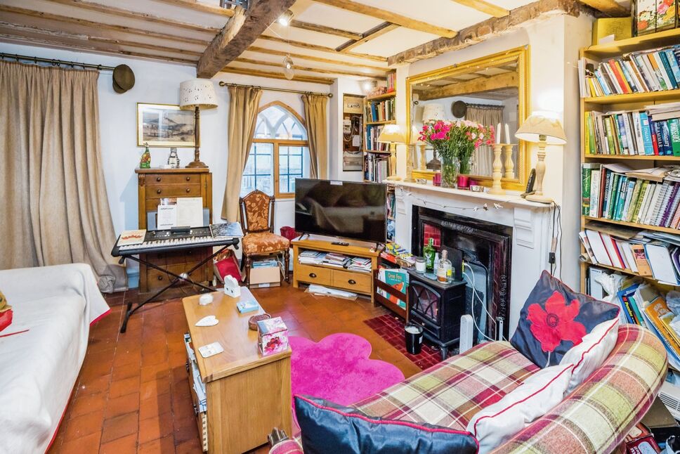 A charming room with a wealth of exposed beams, quarry tiled floor, feature fireplace, radiator, secondary glazed period window to front aspect.
