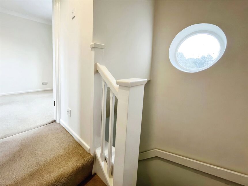 Carpeted stairs rise to the first floor landing with a feature circular window. Connecting doors into