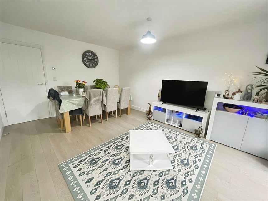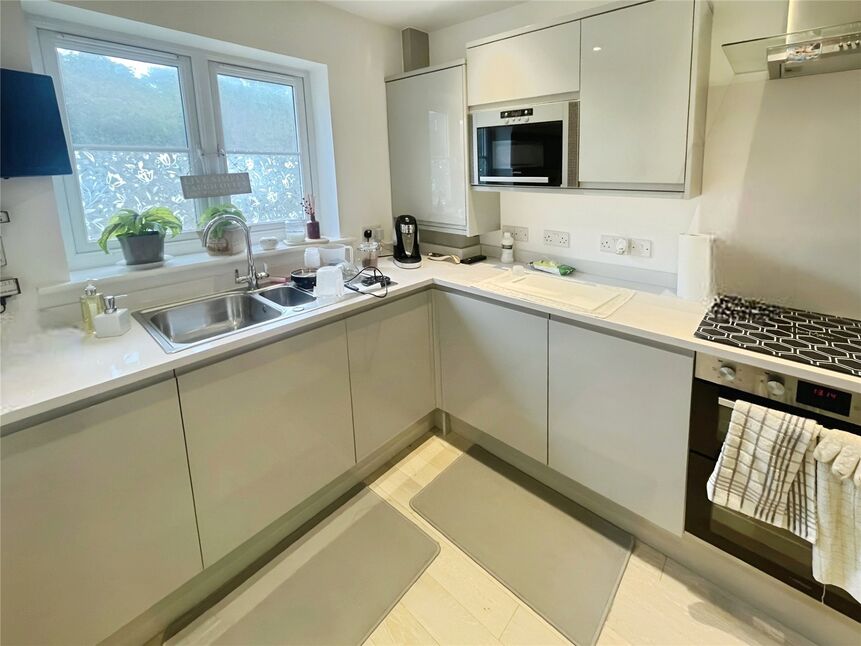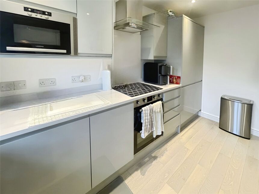 Kitchen benefits from wood laminate flooring, coloured high gloss matching base and wall units, stainless stell sink, electric hob and fan assisted integrated oven. Double glazed front facing window, integrated appliances also include dishwasher, washing machine and fridge.