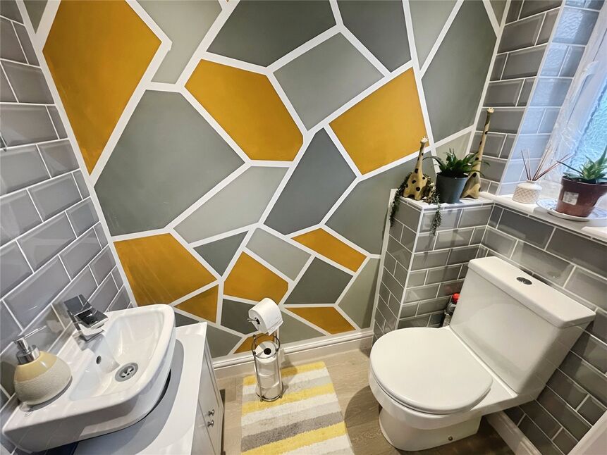 Downstairs W/C benefits from laminate flooring and mostly tiled walls. A double glazed front facing window, LLWC and wash hand basin.