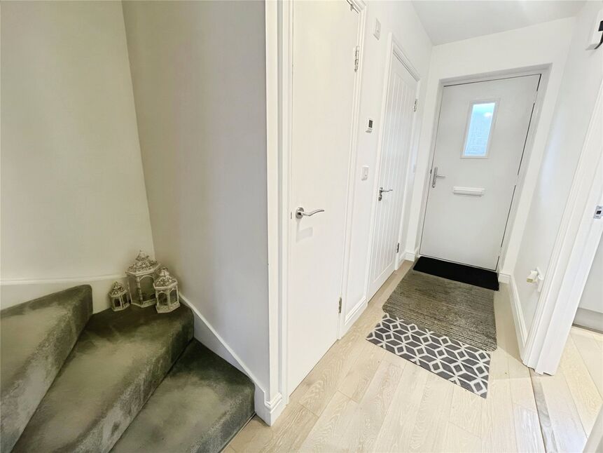 Wood Laminate flooring running through the downstairs, with built in storage cupboard. With doors opening onto Kitchen, Living room and downstairs W/C.