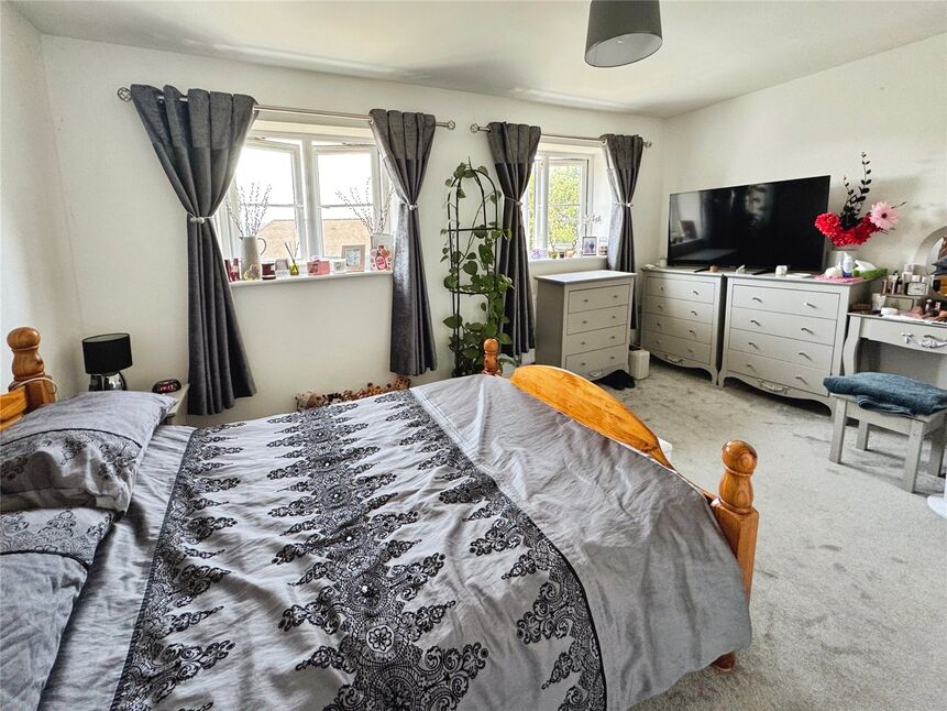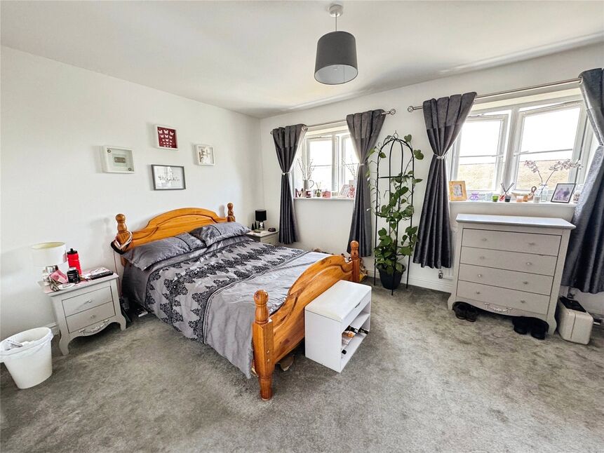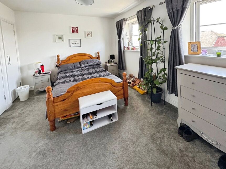 Double bedroom with carpeted flooring, radiator and two front facing double glazed windows.
