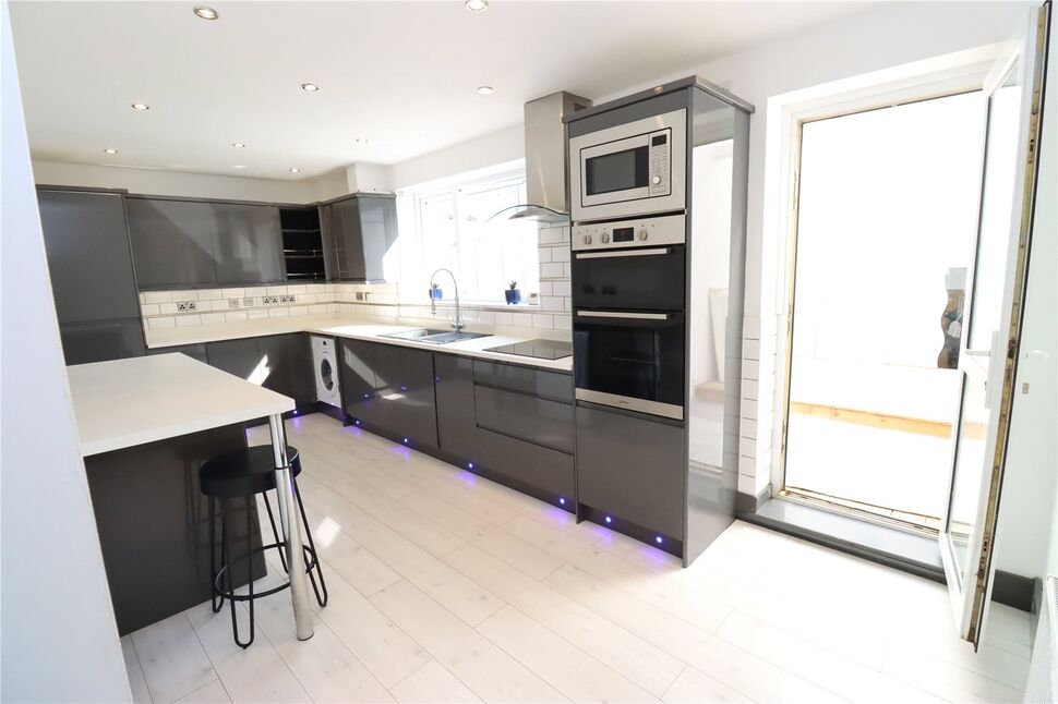 Fitted with a range of modern grey coloured high gloss wall and base units with contrasting work surfaces, built in double electric oven, electric hob, extractor fan above, single sink and drainer, plumbed for washing machine, wall mounted boiler housed in wall unit, tiled splash backs, laminate flooring, radiator, breakfast bar, double glazed window to the rear, under stairs storage cupboard, double glazed door leading into :