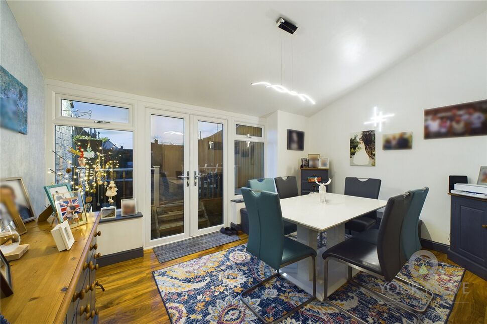 To the rear of the property, an extended living room seamlessly integrates with the newly added dining room, featuring French doors that open to a private garden. The functional layout enhances both the living and entertaining spaces.