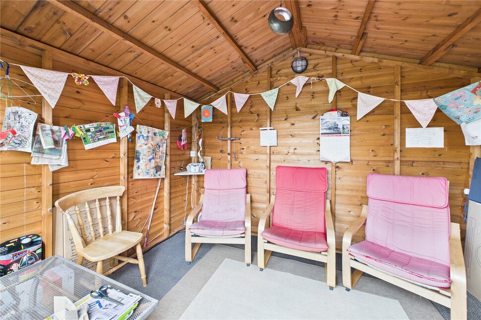 Accessed across a shared right of way, enclosed by fencing, mainly laid to lawn, paved patio area, flower and shrubbery borders, fishpond, fruit trees, vegetable patch, greenhouse and a further shed, both with power.