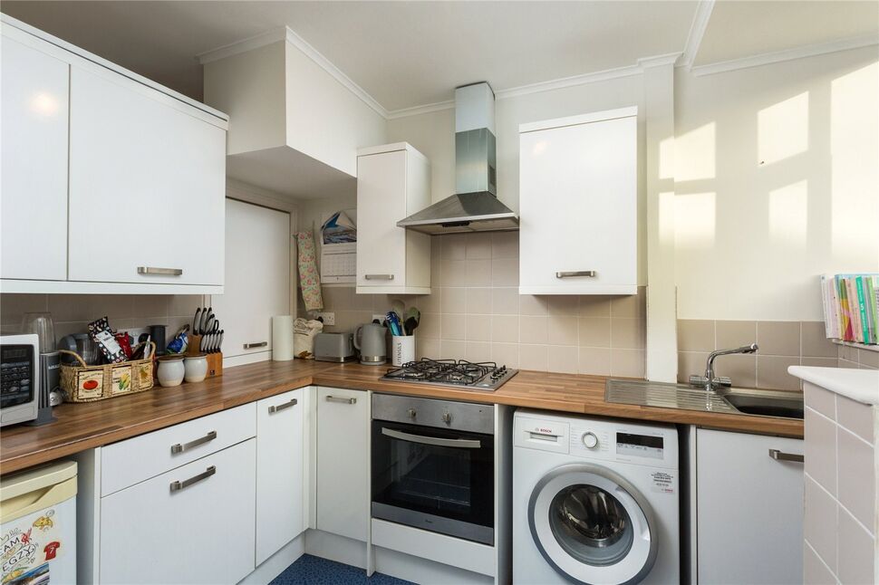 range of units, a gas hob, extractor hood, electric oven/grill, and space for a fridge and washing machine.