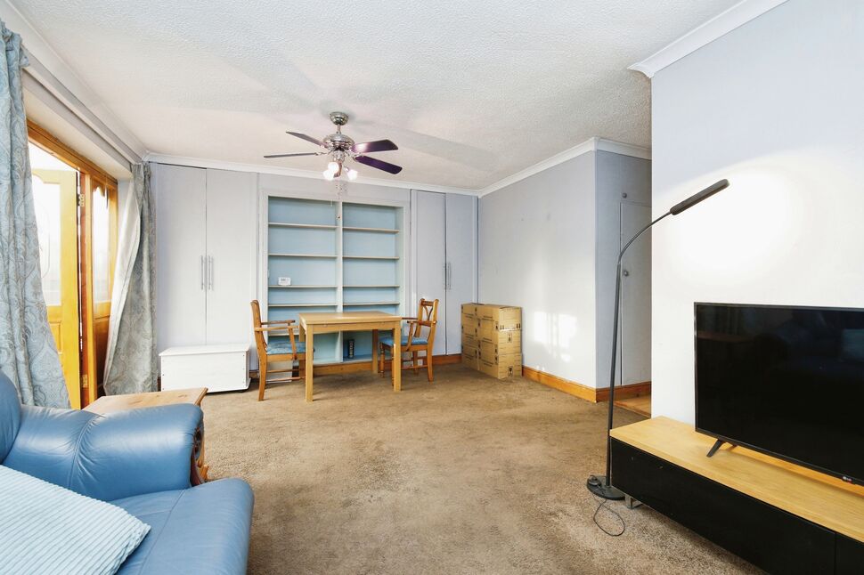 Carpeted flooring, double doors leading to the conservatory. Storage cupboard.