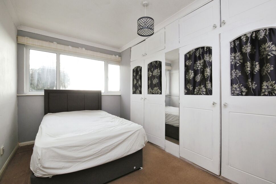 Carpeted flooring and window. Fitted wardrobes for storage.