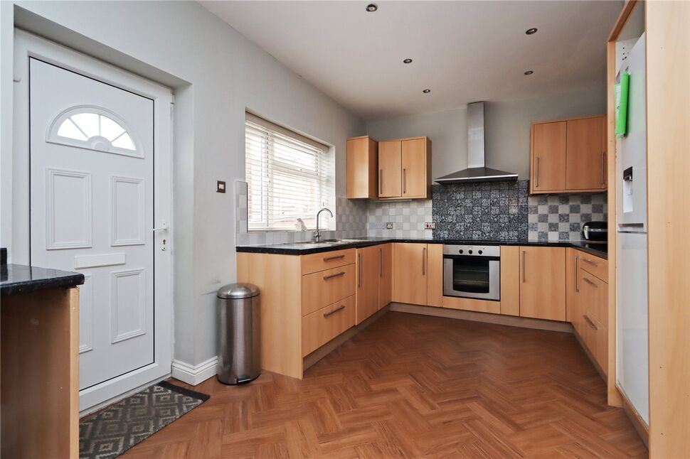 With UPVC double glazing and gas combi. heating (Baxi combi. boiler) - with an impressive energy efficiency rating - the house has oak internal doors throughout, with accommodation comprising, on the ground floor: entrance lobby, spacious living room with decorative feature fireplace and recessed spotlights, and an under-stair storage cupboard. To the rear, there is a fitted kitchen diner which provides enough space for a dining table and comprises wood-effect wall and base units and granite-effect worktops, built-in electric oven, electric hob with extractor over, free-standing fridge/freezer, recessed spotlights, LVT flooring and a door to the steps to the small rear yard.