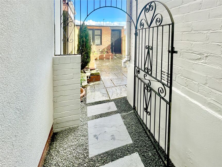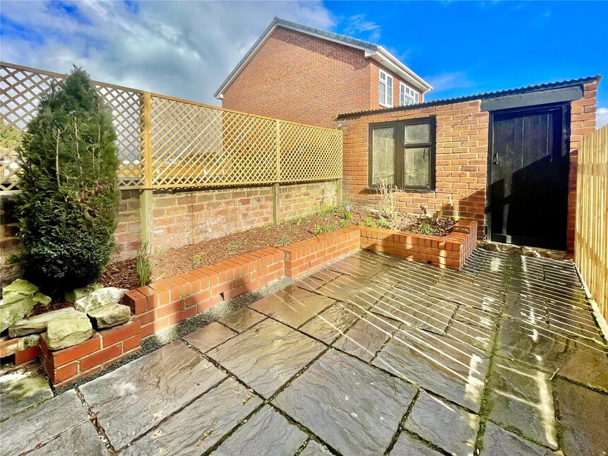 The property enjoys a buffer garden to the front and private garden to the rear, with paved patio area, raised flower beds and useful outbuilding.