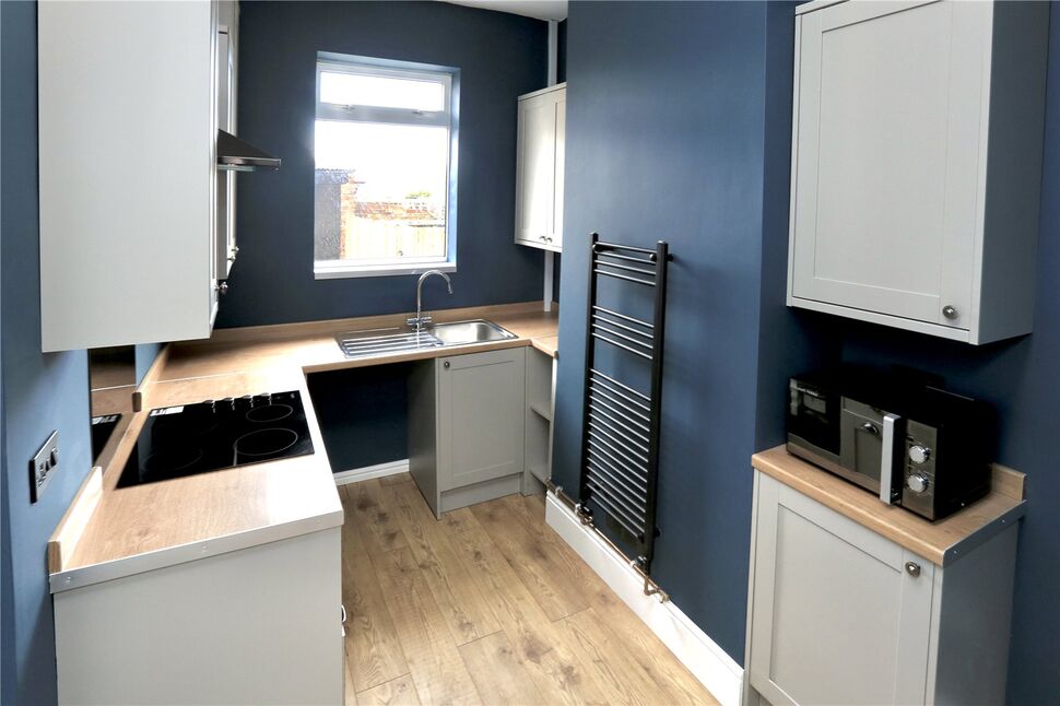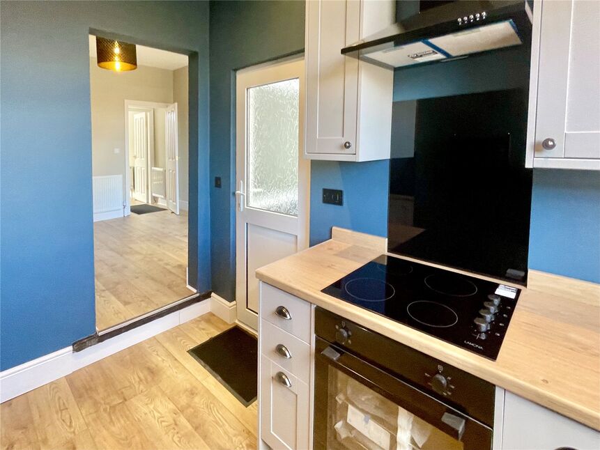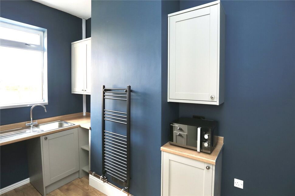 Fitted with a brand new range of contemporary style wall and base units with worktop space. Integrated into the units are a cooking hob, extractor hood, oven, plus space for a washing machine and fridge freezer. There is a sink set beneath a rear facing window, heated towel rail, wood finish flooring and a side facing entrance door.