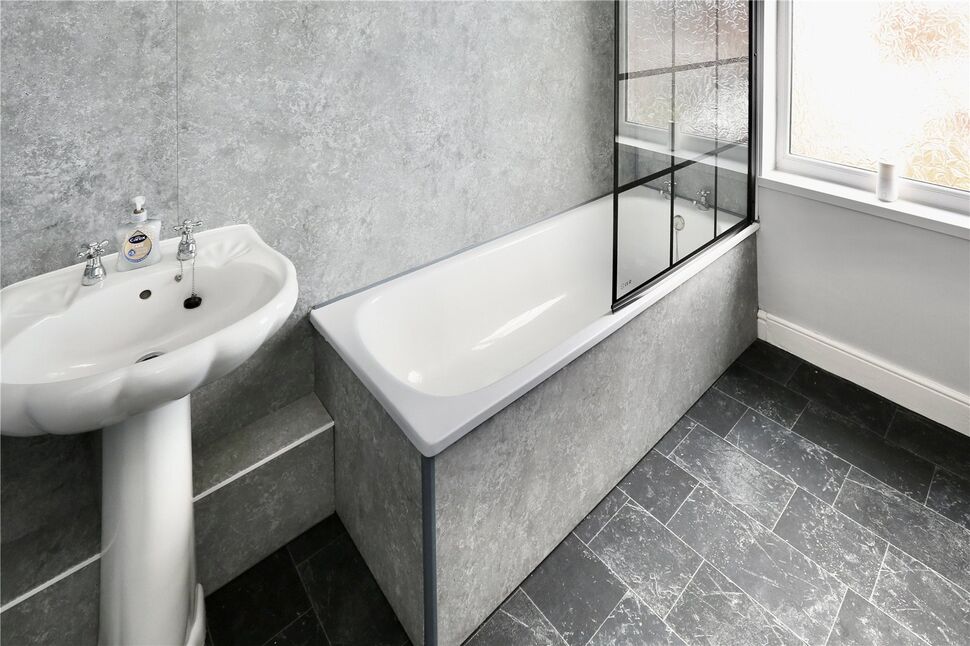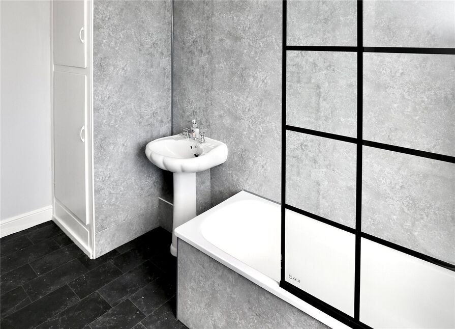 A spacious house bathroom fitted with a suite comprising: bath with shower and screen above, pedestal wash basin and a low flush wc. There is a rear facing window, heated towel rail and built-in cupboard.