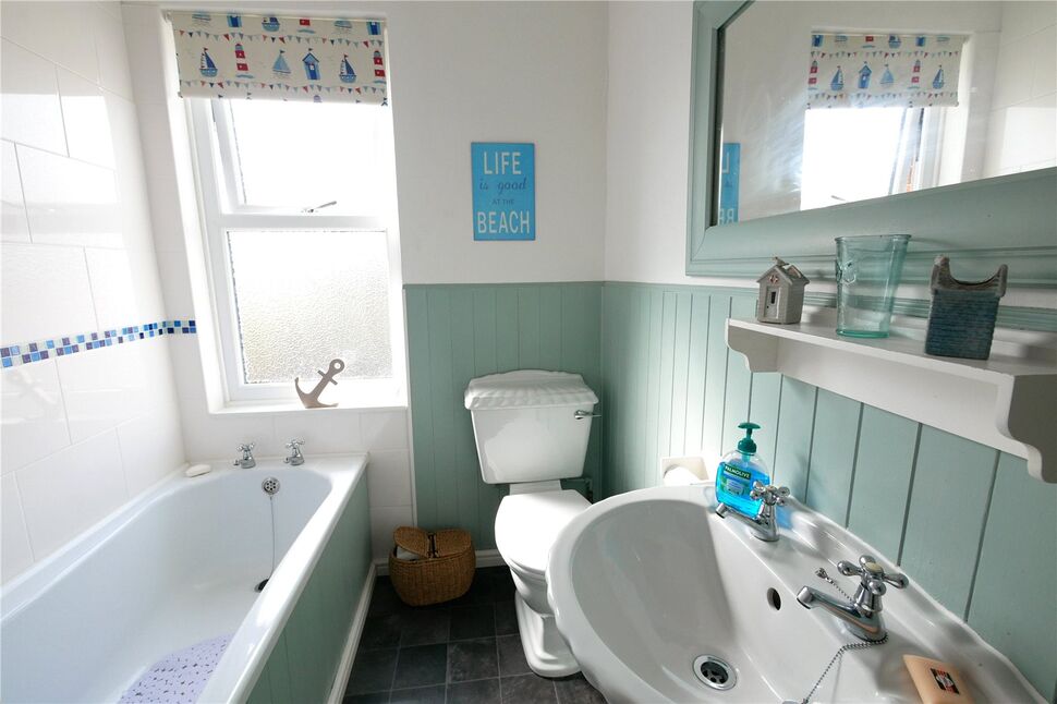 This bathroom features a three-piece suite, including a pedestal wash hand basin with a distinctive shell-effect basin and stainless steel hot and cold taps, WC and a panelled bathtub with an 'Aqua Tronic' electric shower overhead. Half-height panelling lines the walls and vinyl flooring is laid. There are two generous storage cupboards ahead f the bath. The room is also equipped with a radiator and ceiling light.