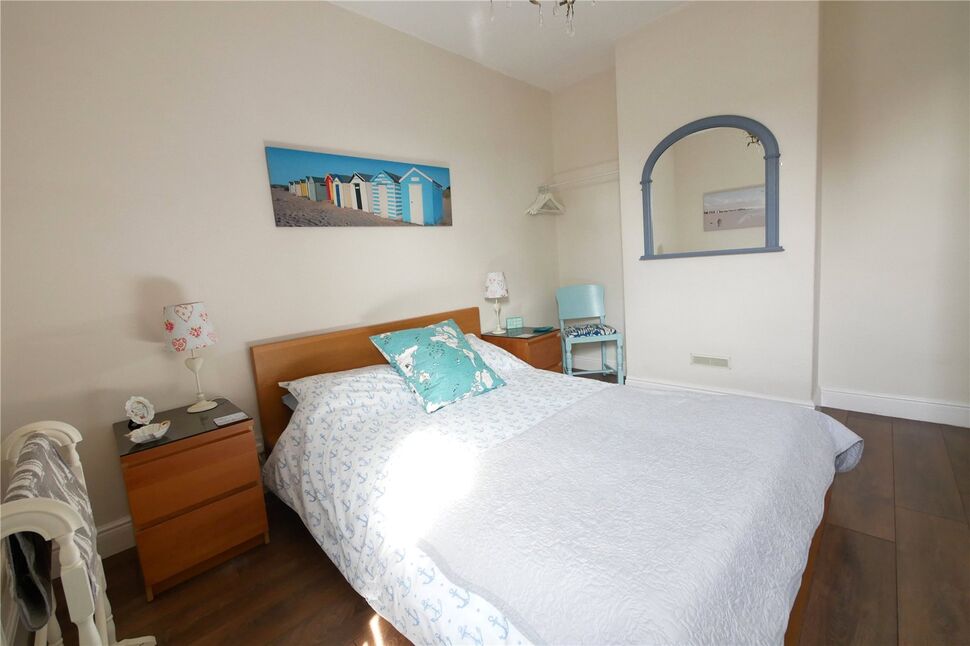 This double bedroom includes a rear double-glazed window, wood-effect laminate flooring, ceiling light and a radiator.