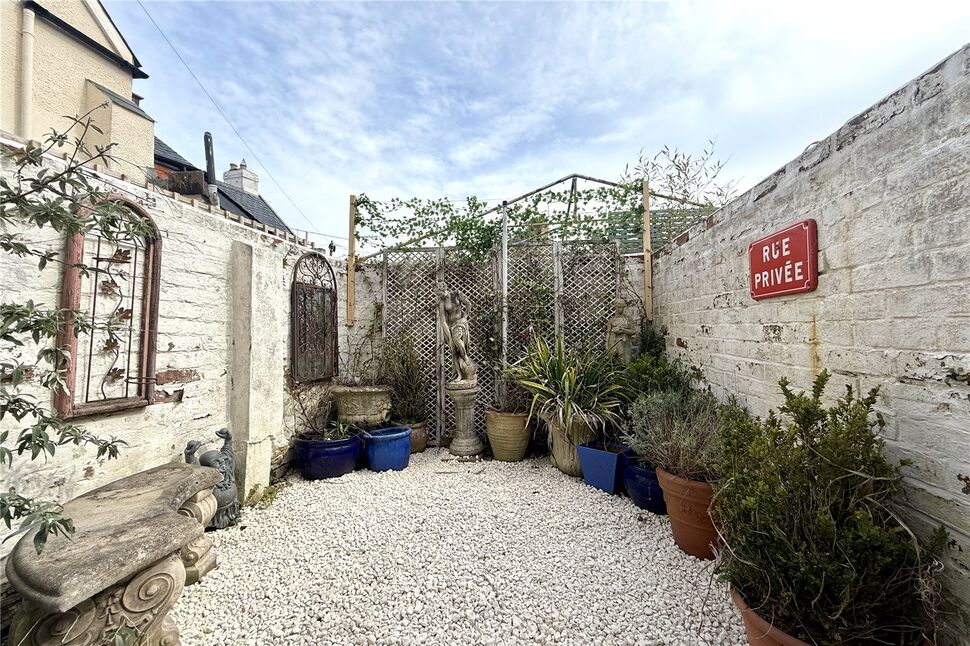 Enclosed, paved courtyard with brick walling and pedestrian gate leading to a covered passage way with a gate leading to the front aspect.