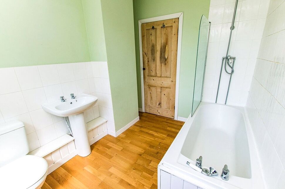 Comprising of panelled bath with shower fitted over, low level WC, pedestal wash hand basin, double glazed frosted window to rear aspect, radiator.