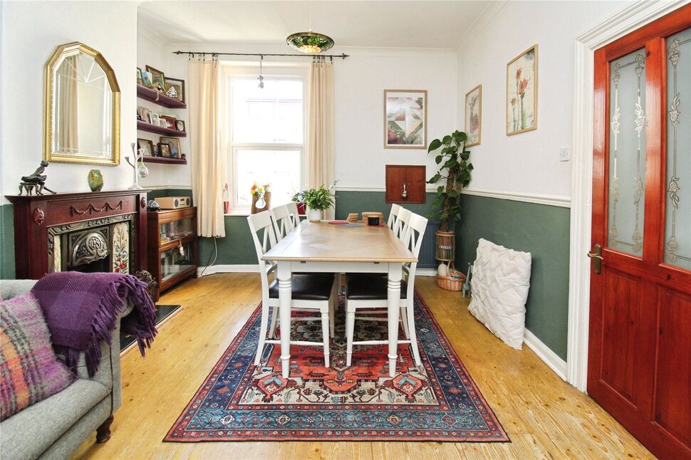 The heart of this home is undoubtedly the newly fitted kitchen. It is flooded with natural light and features a larder for additional storage. The open-plan reception room is a spacious area with large windows, offering a view of the sunny garden. It serves a dual purpose as a lounge and a diner, making it an ideal space for family gatherings and entertaining guests. The second reception room, separate from the open plan area, also has large windows and is set up as a dining room.