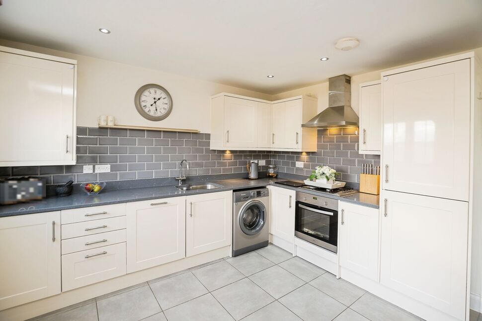 Fitted in a range of base & wall units with granite worktops, comprising 1.5 bowl sink unit with mixer taps, built in appliances including an oven, gas hob, extractor, dishwasher, fridge & freezer, radiator, double glazed French doors leading into the rear garden.