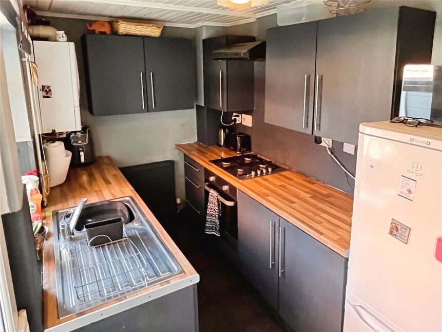 Fitted in a range of base & wall units, comprising sink unit, electric cooker point, plumbing for washing machine, window & door to rear garden.