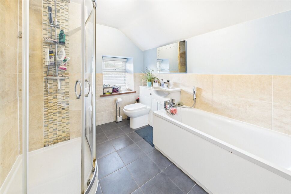 PVCu double glazed window to rear, panelled bath with mixed tap shower, wash hand basin with vanity unit below, shower cubicle, tiled splashbacks, tiled floor, towel rail radiator, extractor fan, loft access, built in cupboard housing gas combi boiler supplying central heating and hot water.