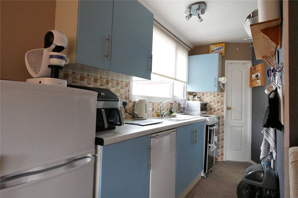 The kitchen features a range of blue wall and base units complemented by cream worktops. A stainless steel sink with drainer and single tap is installed, along with tiled-effect splashbacks. There is space for a freestanding cooker, a freestanding fridge/freezer and an under-counter refrigerator. There is a double glazed window to the side elevation and ceiling light.