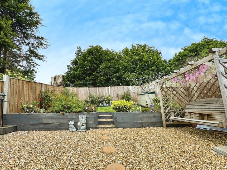 A fence (with 10 year guarantee) enclosed well maintained landscaped garden with paved patio leading up with matching steps to shingle areas and timber steps on to lawned area. Glass safety balustrades. Timber shed. Established planted borders. side access gate.