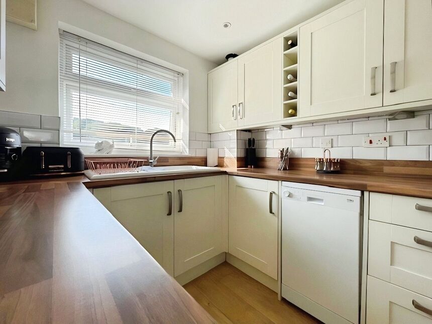 Wood laminate flooring. Part metro tiled walls. The modern shaker style kitchen comprises a range of wall and base units with a rolled edge work surface over and a matching breakfast bar. Inset one and a half bowl ceramic sink and drainer. Fitted extractor hood, low level fridge and freezer. Spaces for washing machine, dish washer and oven. UPVC double glazed window to front aspect. Spot lighting to ceiling.