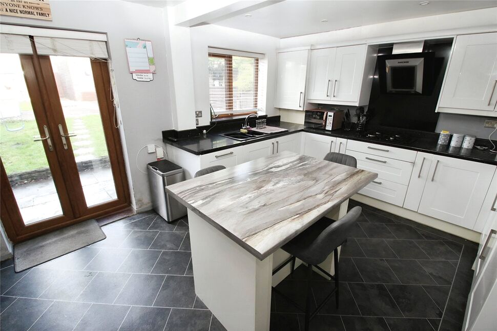 A modern range of wall and base units with a complementary work surface and breakfast bar, single drainer and sink with a mixer tap, integrated double oven and hob, fridge freezer, dishwasher. Laminate flooring, uPvc double glazed window to the rear elevation, feature spot down lights, radiator, stairs to the landing. uPvc double glazed French doors to the rear garden.