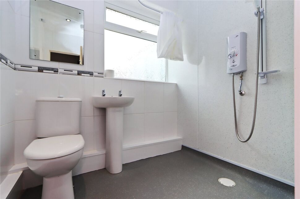 The first bedroom is generously sized, comfortably fitting a double bed and providing plenty of natural light, creating a warm and welcoming atmosphere. The second bedroom is equipped with built-in wardrobes, offering excellent storage space. The bungalow also features a well-sized bathroom with a toilet, sink, and shower.