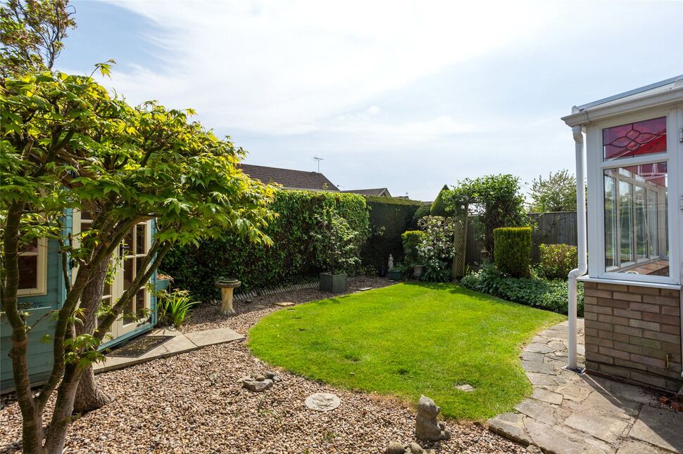 - Southeast-facing rear garden with lawn, seating, summerhouse, and mature planting