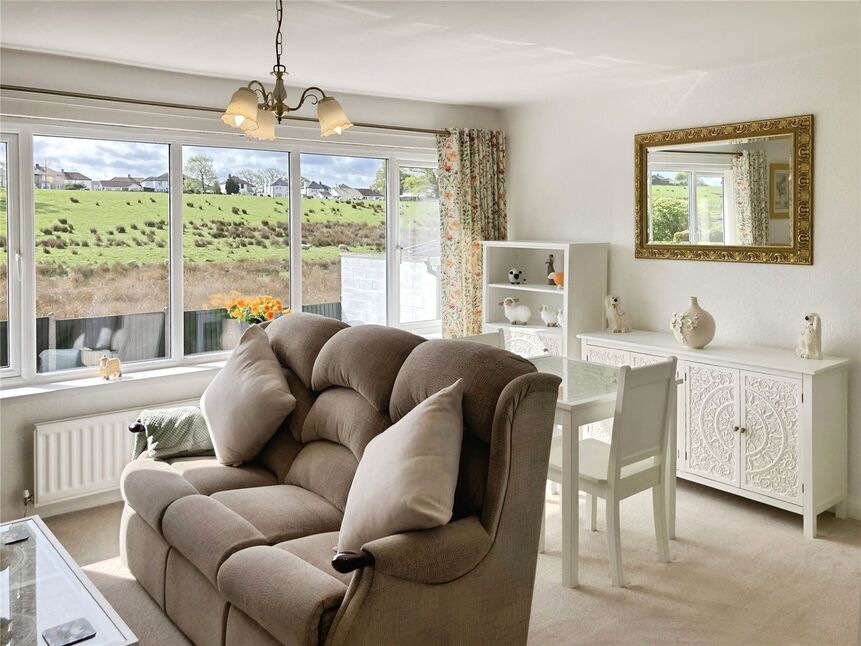 Large room with picture window to take in the views, electric fire and feature fireplace.