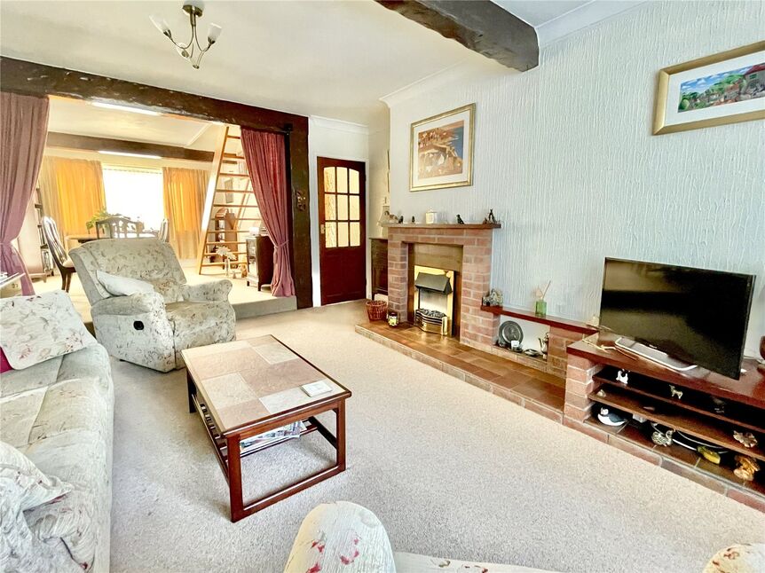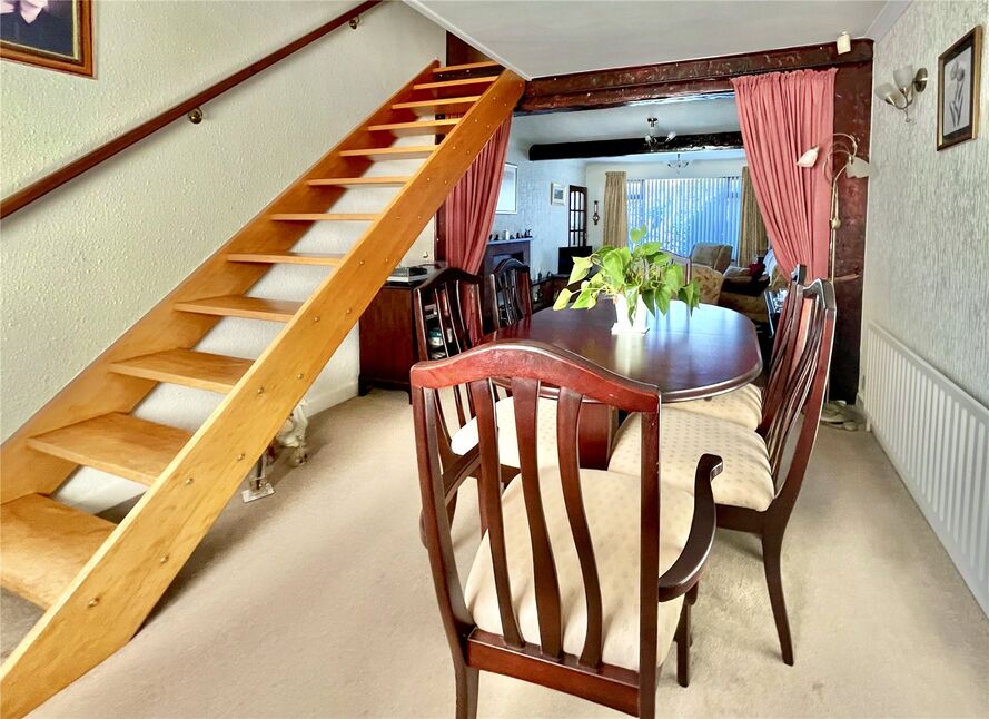 A superb size main reception room with front and rear facing windows, the living area has a feature fireplace with display shelving, an opening leads into the dining area which has a staircase rising to the first floor.