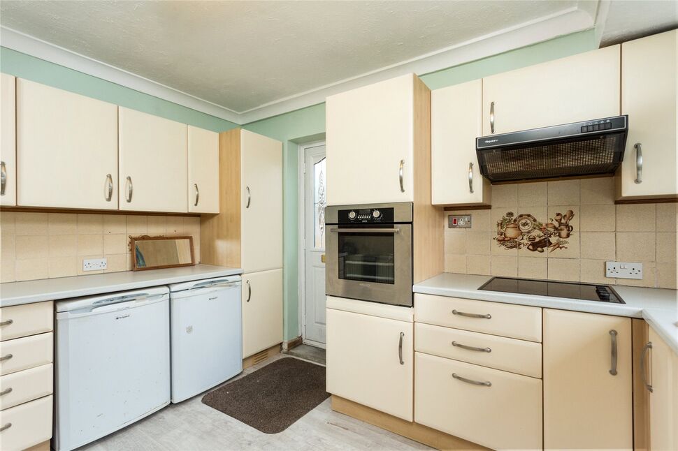 The property is entered from the side into a well-equipped kitchen, fitted with a range of storage units and integrated appliances, including an electric hob, electric oven/grill, and designated spaces for a fridge, freezer, and washing machine.