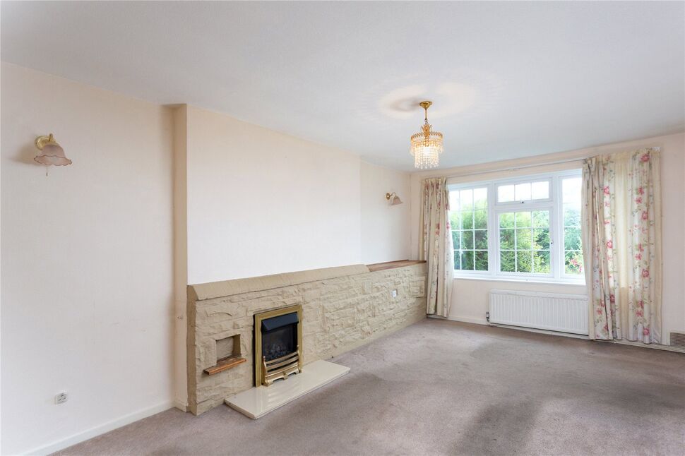 Outside, the front garden is lawned with mature shrub borders, while a driveway to the side offers off-street parking and leads to a detached garage. The rear garden, enjoying a sunny south-west orientation, has a lawn, a patio seating area and a wooden shed.
