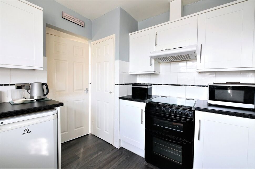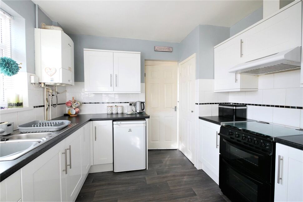 Double glazed window to the front, a modern fitted kitchen comprising base units having rolled edge work surfaces over and matching wall units. Inset one and a half bowl stainless steel sink and drainer unit with mixer tap, splash back wall tiling, space and connection for a gas cooker with extractor hood above and wall mounted Worcester gas boiler, built in storage cupboard with shelving and door to the lounge diner.
