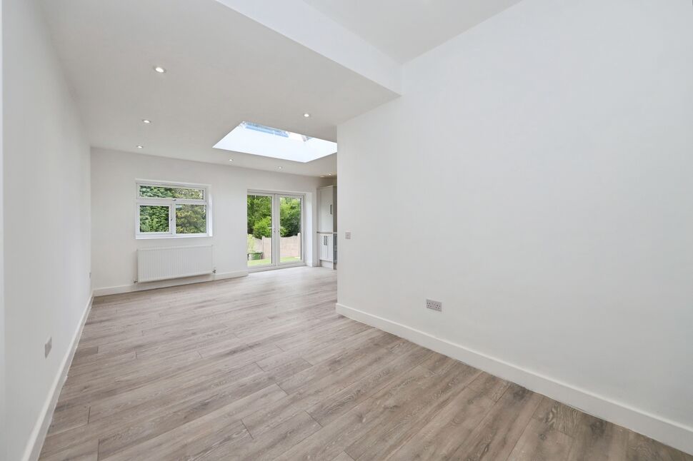 Inside, the property boasts an open-plan layout that has been extended and refurbished to a high standard. The living accommodation includes a generous reception room, open-plan to the kitchen/ dining area, complemented by large windows offering an abundance of natural light and stunning views of the garden. The room also provides direct access to the garden, seamlessly blending indoor and outdoor living.