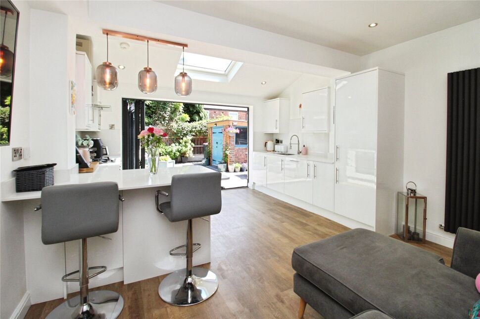 The home has a beautiful living room at the front, with a bay window providing plenty of natural light, and a log burner for cosy nights in. The heart of the home is undoubtedly the open-plan kitchen. It's equipped with granite countertops and a breakfast area. The room is filled with natural light, and there's ample space for dining. Large bifold doors open onto a private garden, seamlessly blending indoor and outdoor living and making it a perfect space for entertaining or relaxing.