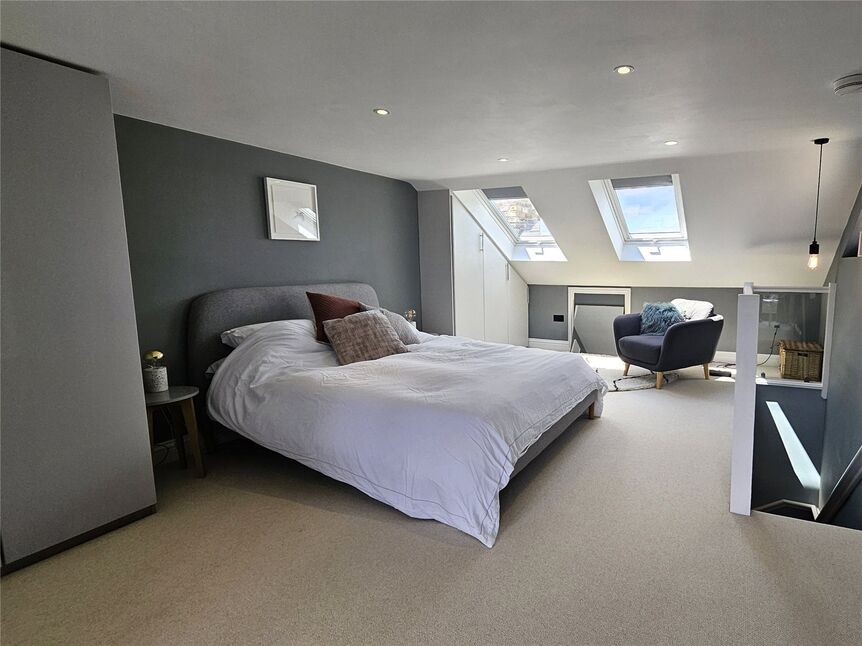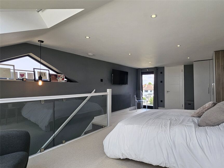 Juliet balcony, Skylights, contemporary glass balustrade to staircase, fitted wardrobes, dual aspect double glazed windows.