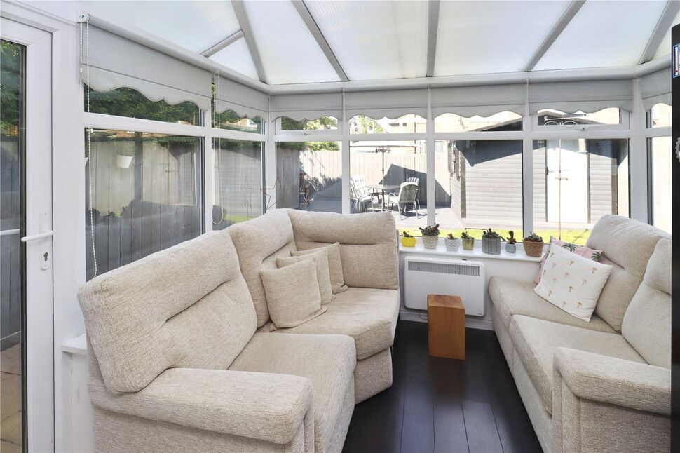 Fitted with a range of white wall and base units with roll top work surfaces, one and a half bowl sink and drainer, built in double electric oven, gas hob, integrated fridge freezer and washing machine, double glazed window to the rear, tiled splash backs, radiator and double glazed door leading into conservatory.