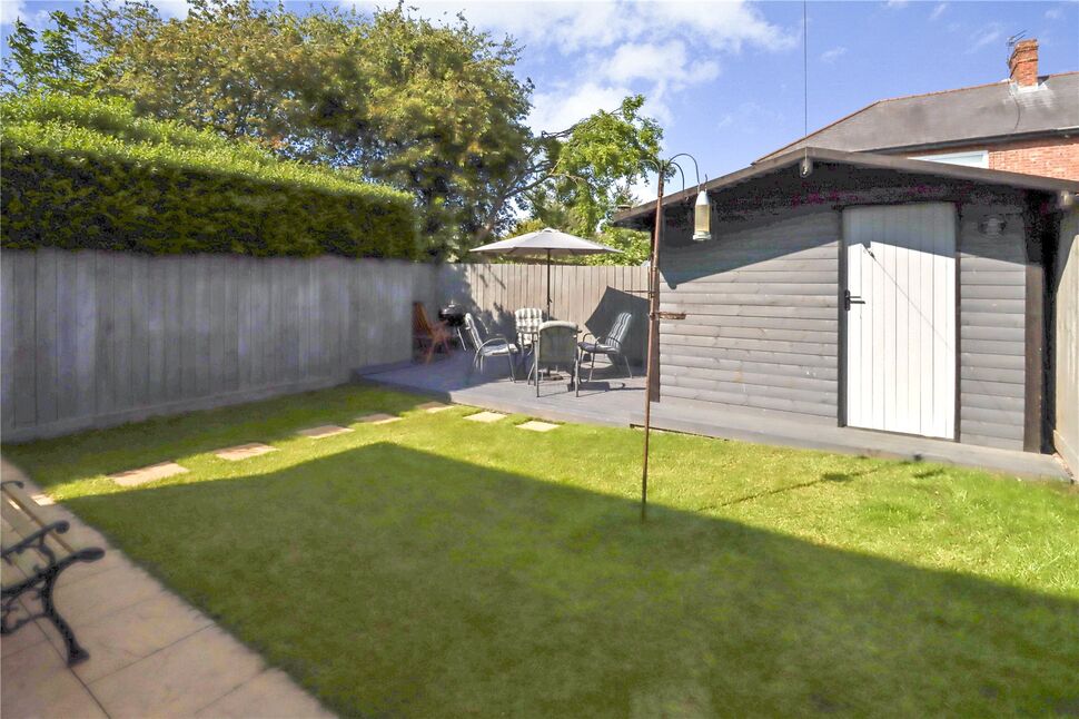 Rear garden- fenced to sides and rear with gate to front access, paved patio area, laid to lawn, decked rear terrace, wood shed with bar area. Front garden- Hedged with patio area, electric car charging point.Drive to front providing off street parking for two cars.