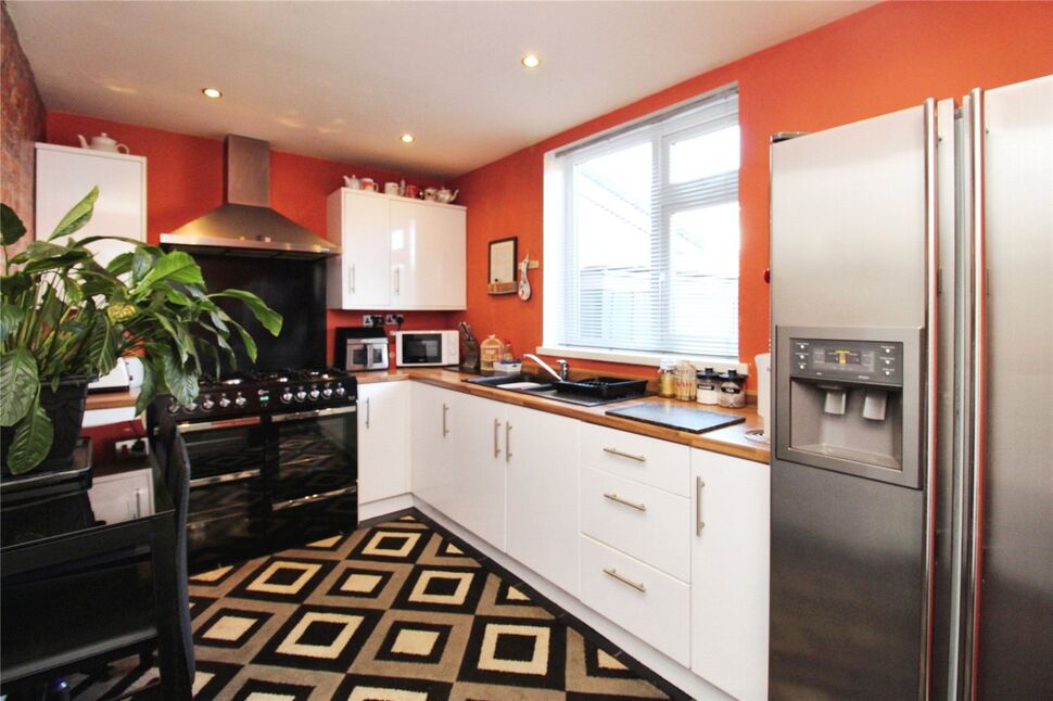Fitted kitchen with freestanding cooker and Fridge / Freezer. UPVC Double glazed window overlooking the rear garden.
