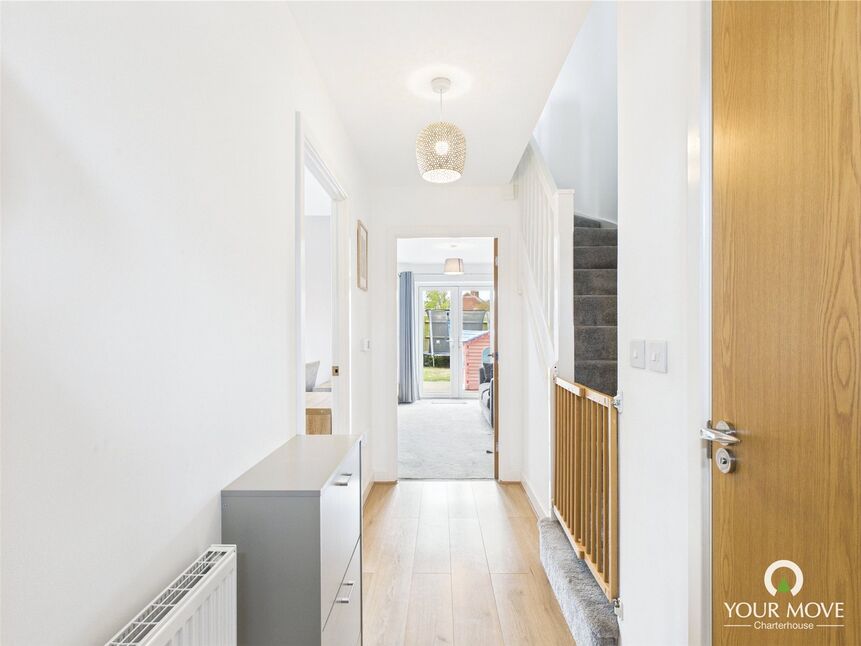 Via a modern composite door, click wood effect flooring, radiator, smoke alarm, thermostat.