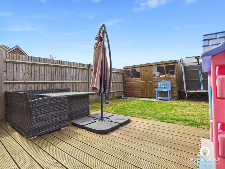Sunny enclosed south-west facing with gated side access, outside light and tap, decked area, lawn, shed.