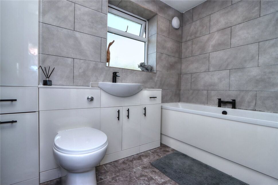 The First Floor landing leads to the bedrooms with Bedroom 1, to the front, having a good range of wardrobes with sliding doors. Bedroom 2 is to the rear, with access to the part boarded loft via a retractable ladder. Bedroom 3 is to the front. The Bathroom/WC has been refurbished with a contemporary white suite with modern chrome fittings comprising low level WC, vanity unit hand basin and bath with mains shower unit and shower screen.