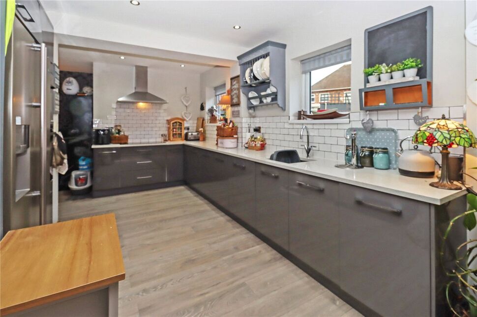 Fitted grey coloured high gloss base units with granite work surfaces, integrated sink and drainer, instant hot tap, built in double electric oven and microwave, five burner induction hob with extractor chimney above, integrated dish washer, tiled splash backs, two double glazed windows to the rear, panelled radiator, laminate flooring and open through to: