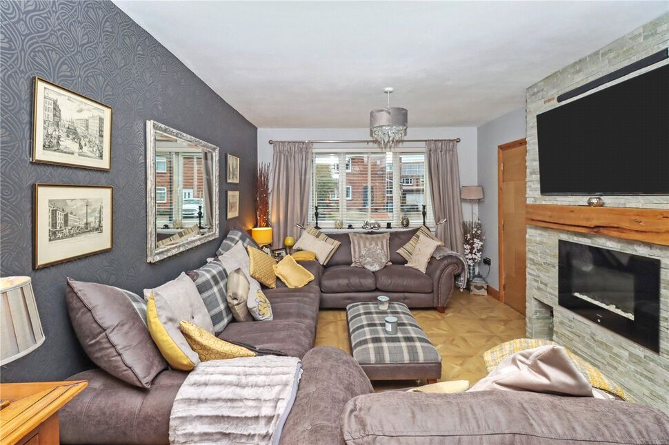 Double glazed window to the front, feature tiled media wall fireplace with electric fire, radiator, wood flooring, double glazed French doors to the rear and open through to: