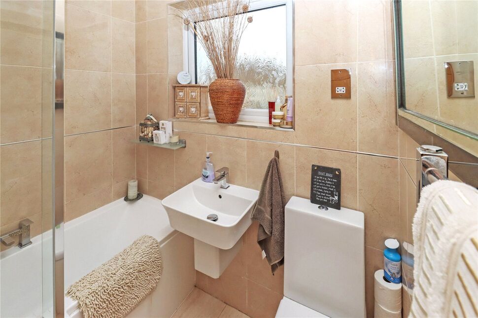 Three piece white suite comprising of: Panelled shower bath with plumbed rain fall shower and glazed screen, pedestal wash hand basin, low level WC, tiled walls, tiled flooring, double glazed frosted window to the rear and heated towel rail.