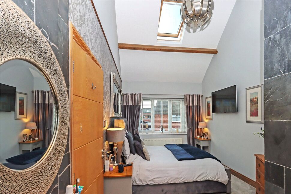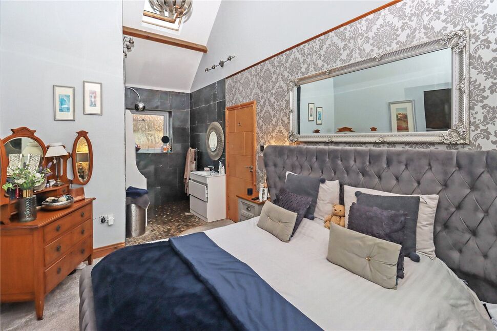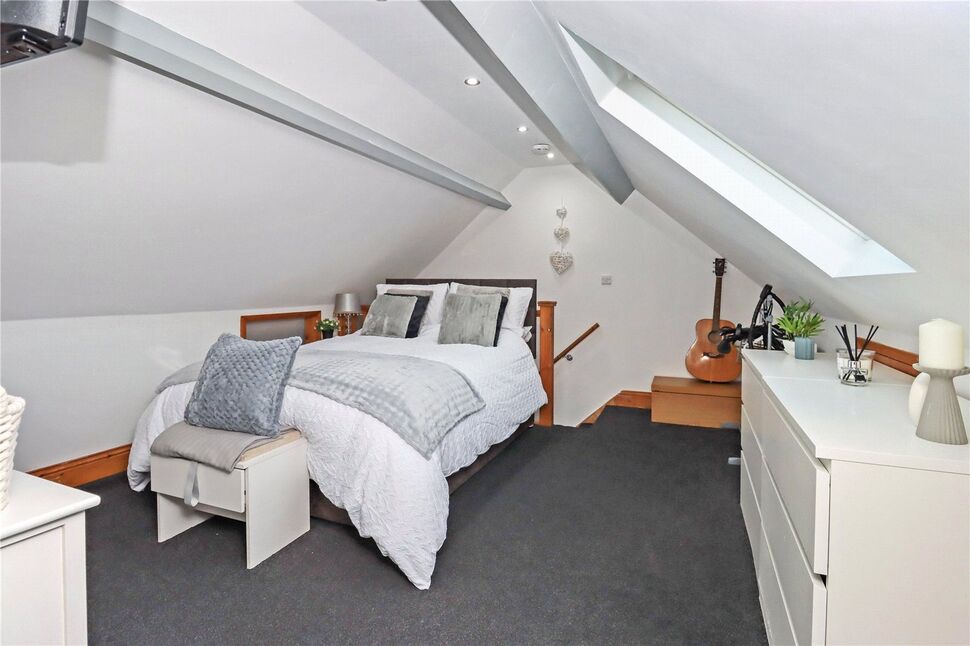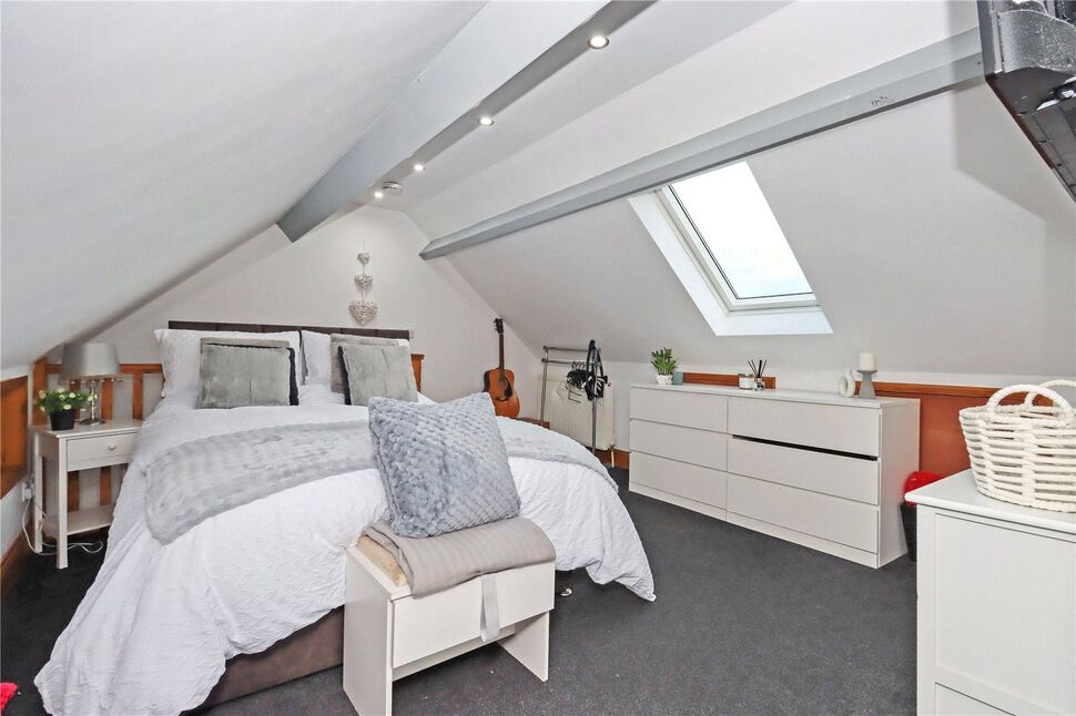 Double glazed window to the front, Vaulted ceiling with wood beams, two double glazed electric Velux windows, radiator and walk in: