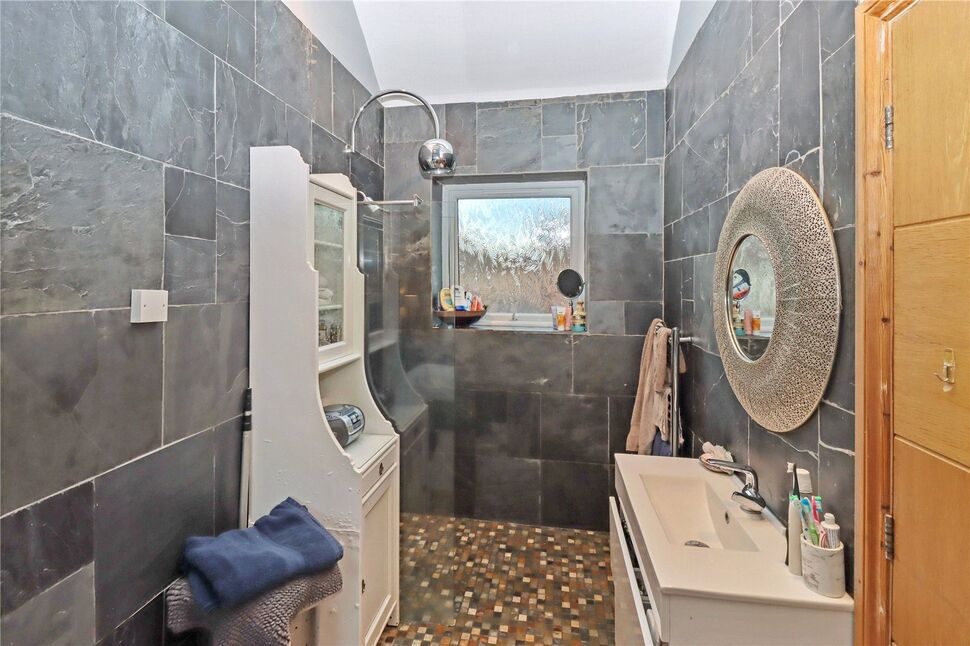 Plumbed twin rain fall shower and shower, glass screen, vanity wash hand basin, double glazed frosted window to the rear, tiled walls and tiled flooring, heated towel rail and extractor fan.