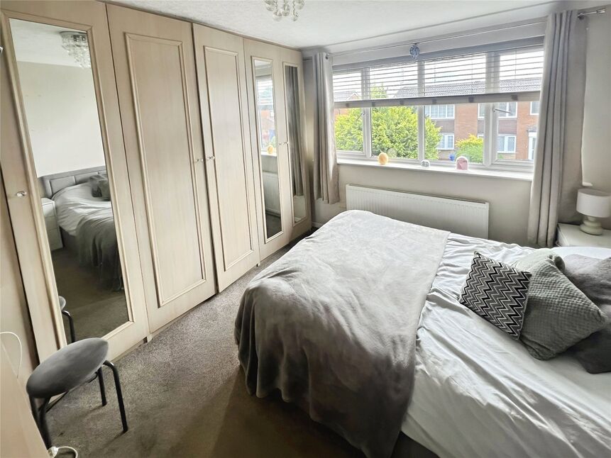 Carpeted with a window at the front, fitted wardrobes and a radiator